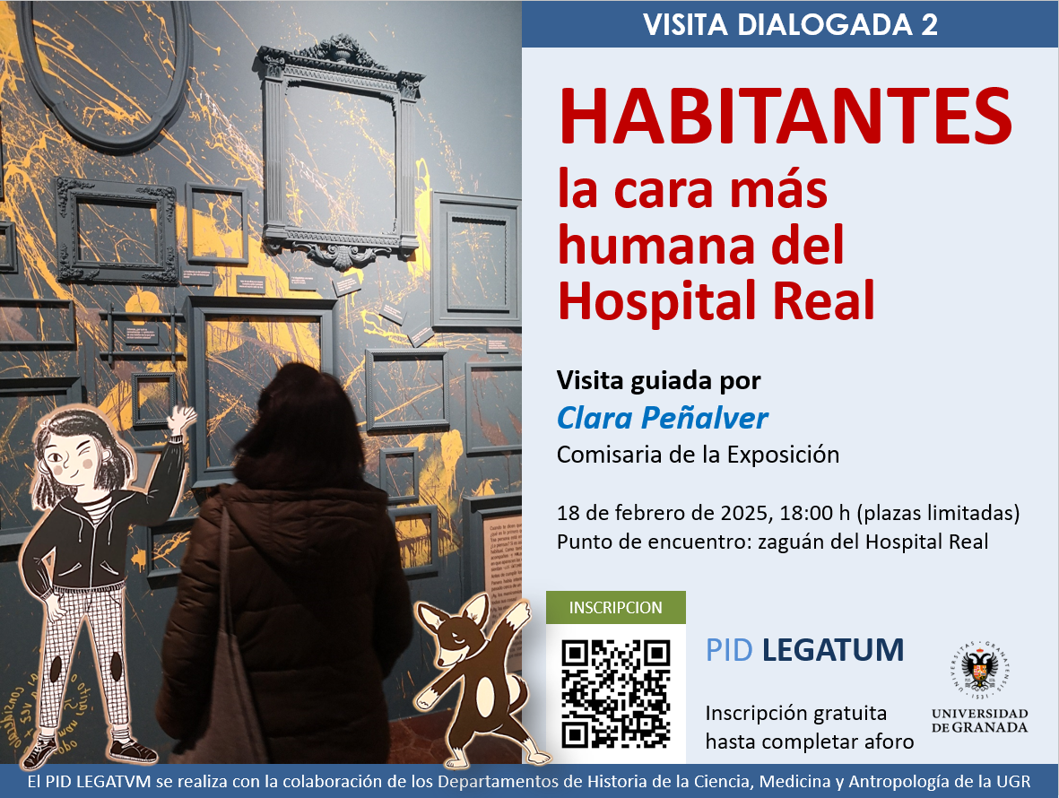 ‘Habitantes. La cara más humana del Hospital Real’, es una instalación ideada y comisariada por Clara Peñalver, con diseño gráfico de Patricia Garzón y museográfico de Manuel Rubio, concebida para acercar a nuestros sentidos y, con ello, a nuestro conocimiento, la esfera más sobresaliente de lo inmaterial del patrimonio de la Universidad de Granada: la esencia del ser humano. La muestra invita a visitantes de todas las edades a explorar la rica y compleja historia de quienes habitaron los espacios de uno de los edificios más emblemáticos de la ciudad, el Hospital Real, actual sede del Rectorado de la Universidad, que ha sido testigo de más de 500 años de vida social y cultural.